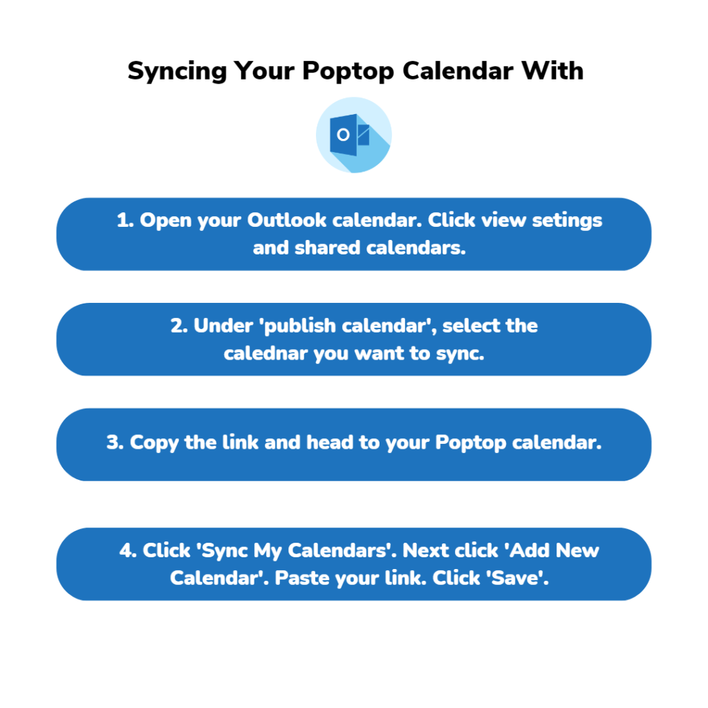 Like the previous calendars, syncing your Outlook calendar to Poptop is a quick and easy process. Here’s what you need to do.